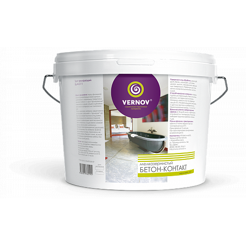 Грунтовка VERNOV ВД-АК-0111 (бетон-контакт мелкозернистая), 14 кг для внутренних и наружных работ. Область применения: перед финишной отделкой декоративными фактурными штукатурками, мозаичными покрытиями, наклейкой плитки и т.п. Для «армирования» поверхности с целью лучшего сцепления наносимого материала или плиточного клея. После нанесения материал закрепляется на подложке, заполняет и «армирует» её. Грунт увеличивает прочность подложки, предотвращая отслаивание покрытия, улучшает адгезионные свойства наносимого материала. Существенно снижает расход наносимого материала. Покрытие паропроницаемое (дышащее). По той причине, что материал является экологически чистым, практически не имеет запаха и быстро сохнет, возможно проводить грунтовочные работы без изоляции помещения. Поверхности под обработку: дерево (ДВП, ДСП) , бетон, гипсокартон, штукатурки, шпатлевки, цемент, кирпич, стекловолокно, ранее окрашенные поверхности. Указания по применению: материал тщательно перемешать. Наносить кистью, валиком, шпателем при температуре от +5С до +30С. Не рекомендуется смешивать с другими грунтами и разбавителями. Разбавитель: вода. Инструмент: кисть, валик, распылитель. Плотность: 1,36 кг/л. Ориентировочный расход на один слой: кг на 1-3 м². Время высыхания при +23⁰С и относительной влажности 50%: 3 часа.