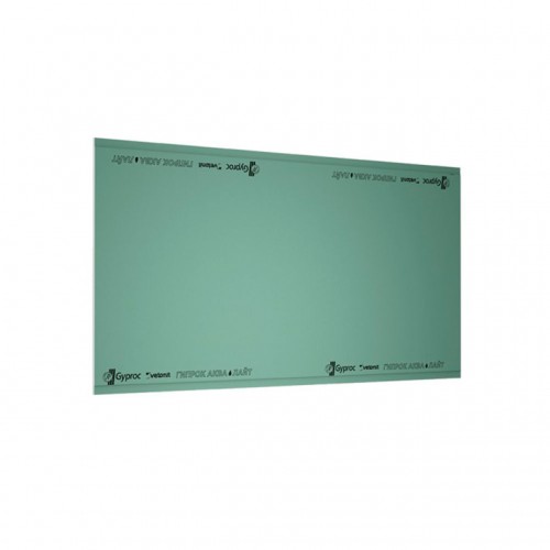 Гипсокартон влагостойкий 9,5 мм (ГКЛВ-9,5) Gyprok ― состоит из листов картона и гипсового сердечника содержащего гипс и гидрофобные и фунгицидные пропитки, что позволяет применять его в сухих помещениях и в помещениях с повышенной влажностью. Применяется для изготовления перегородок (стен) и их выравнивания. Используется для конструкций многоуровневых потолков, в которых можно скрыть коммуникации. Крепится лист саморезами на обрешетку, собранную из металлопрофиля. Между листами укладывают минеральную вату для шумоизоляции. Стыки заделывают армированной сеткой с нанесением шпатлевки. На всю поверхность наносят финишный слой шпатлевки и шлифуют, далее на полученную ровную белую стену наносят декоративный слой обои или окрашивают в нужный цвет, подобранный по дизайну.