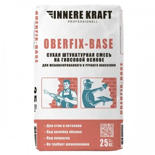 Смесь штукатурная OBERFIX-BASE на гипсовой основе предназначена для выравнивания, оштукатуривания механизированным и ручным способом поверхностей стен, потолков, а так же в качестве основания под последующее нанесение декоративных покрытий (декоративной штукатурки, краски, и т.п.), при строительстве, реконструкции, ремонте зданий и сооружений на объектах гражданского и промышленного строительства. Расход сухой строительной смеси 9-9,5 кг на 1 м² готовой поверхности при слое 10 мм, при соблюдении последовательности операций и пропорций смешивания. Толщина слоя: минимум 5 мм, максимум 30 мм.